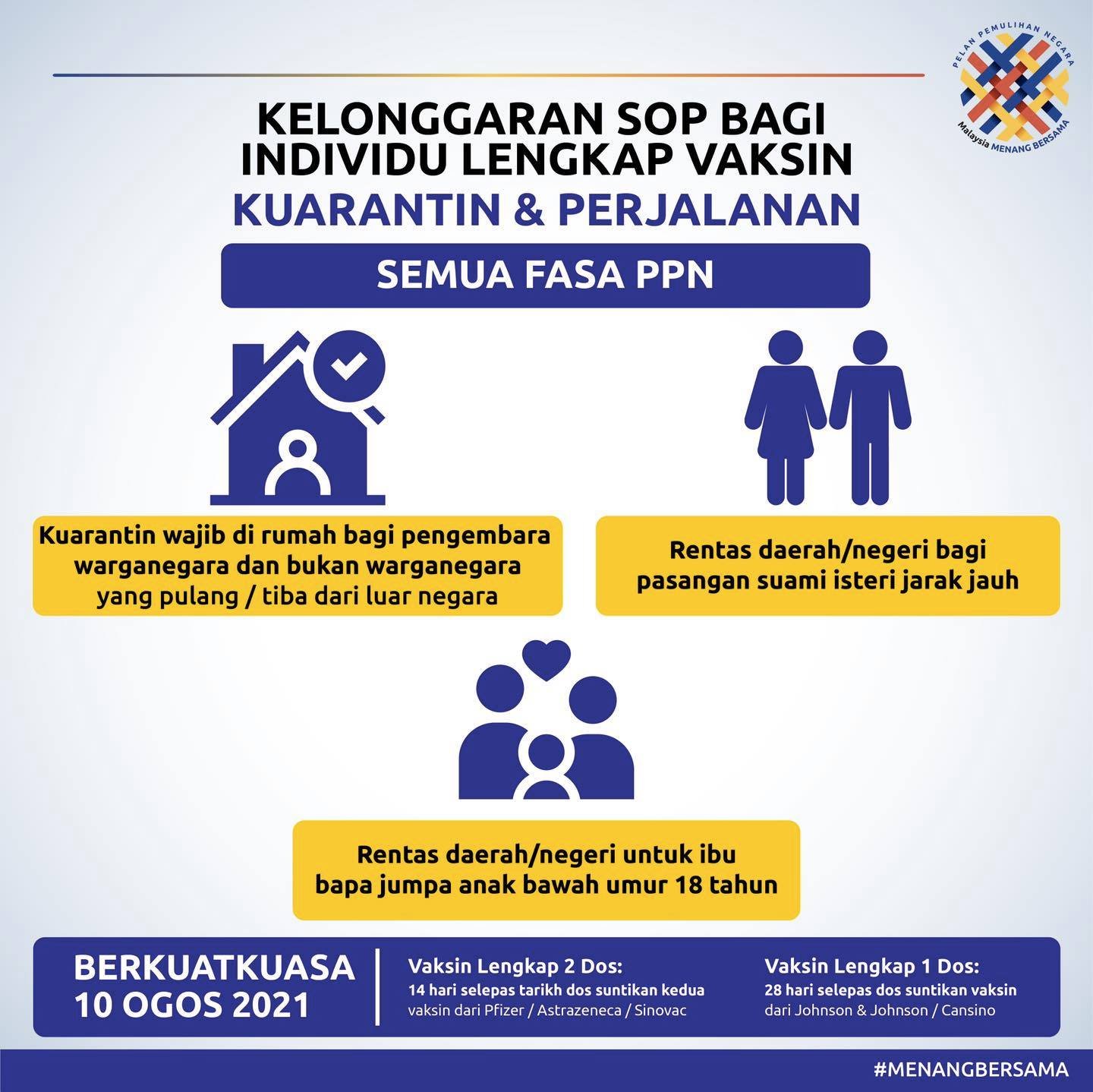 Alhamdulillah, seperti yang diumumkan YAB Perdana Menteri, Majlis Pemulihan Negara telah bersetuju untuk memberi beberapa kelonggaran kepada rakyat yang telah lengkap divaksinasi. Keputusan ini dibuat berdasarkan nasihat pakar serta fakta sains dan data yang diperoleh di peringkat antarabangsa dan domestik.