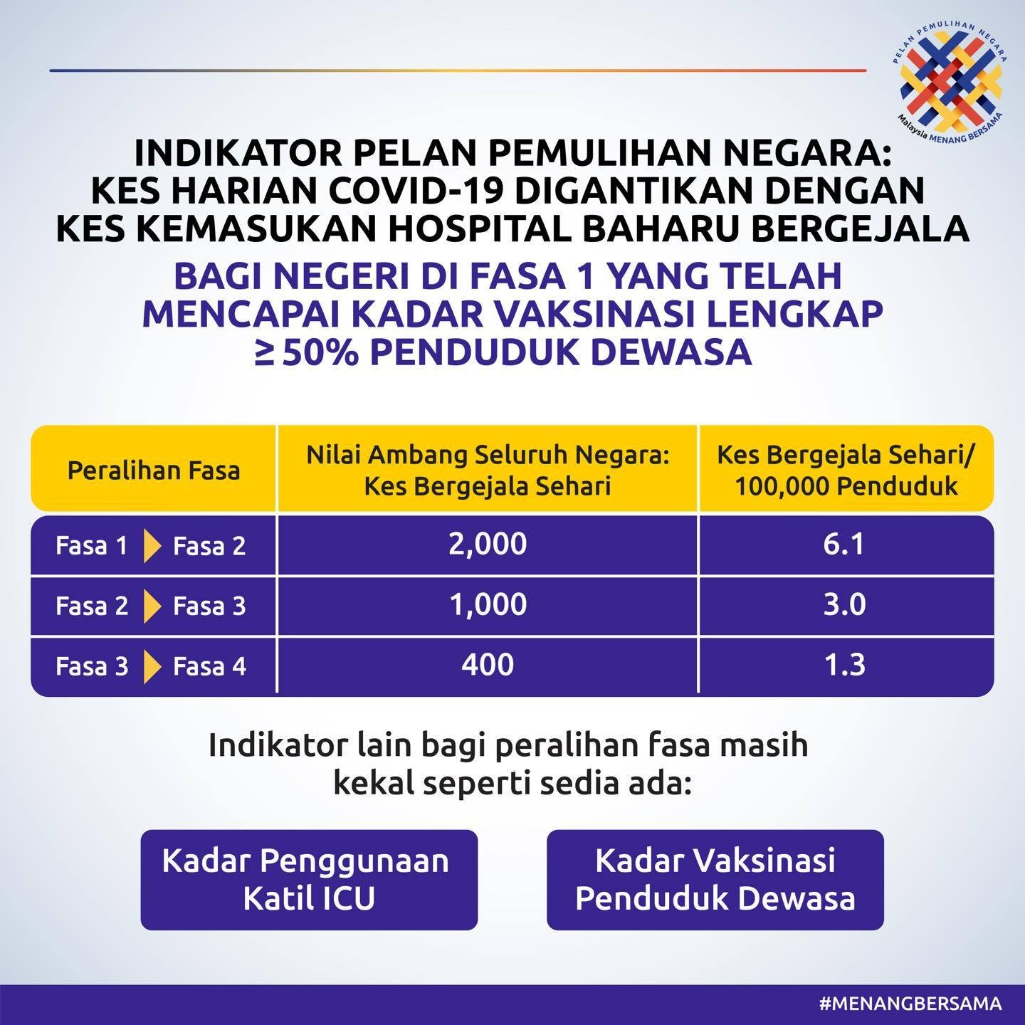 Selaras dengan nasihat pakar kesihatan, serta pengalaman antarabangsa dan domestik yang menunjukkan bahawa peningkatan kadar vaksinasi dapat menurunkan beban kepada kapasiti kesihatan awam, Majlis Pemulihan Negara telah bersetuju untuk menggantikan indikator Kes Harian COVID-19 kepada Kes Kemasukan Hospital Baharu Bergejala bagi negeri di Fasa 1 yang telah mencapai kadar vaksinasi lengkap sekurang-kurangnya 50% penduduk dewasa. ⠀