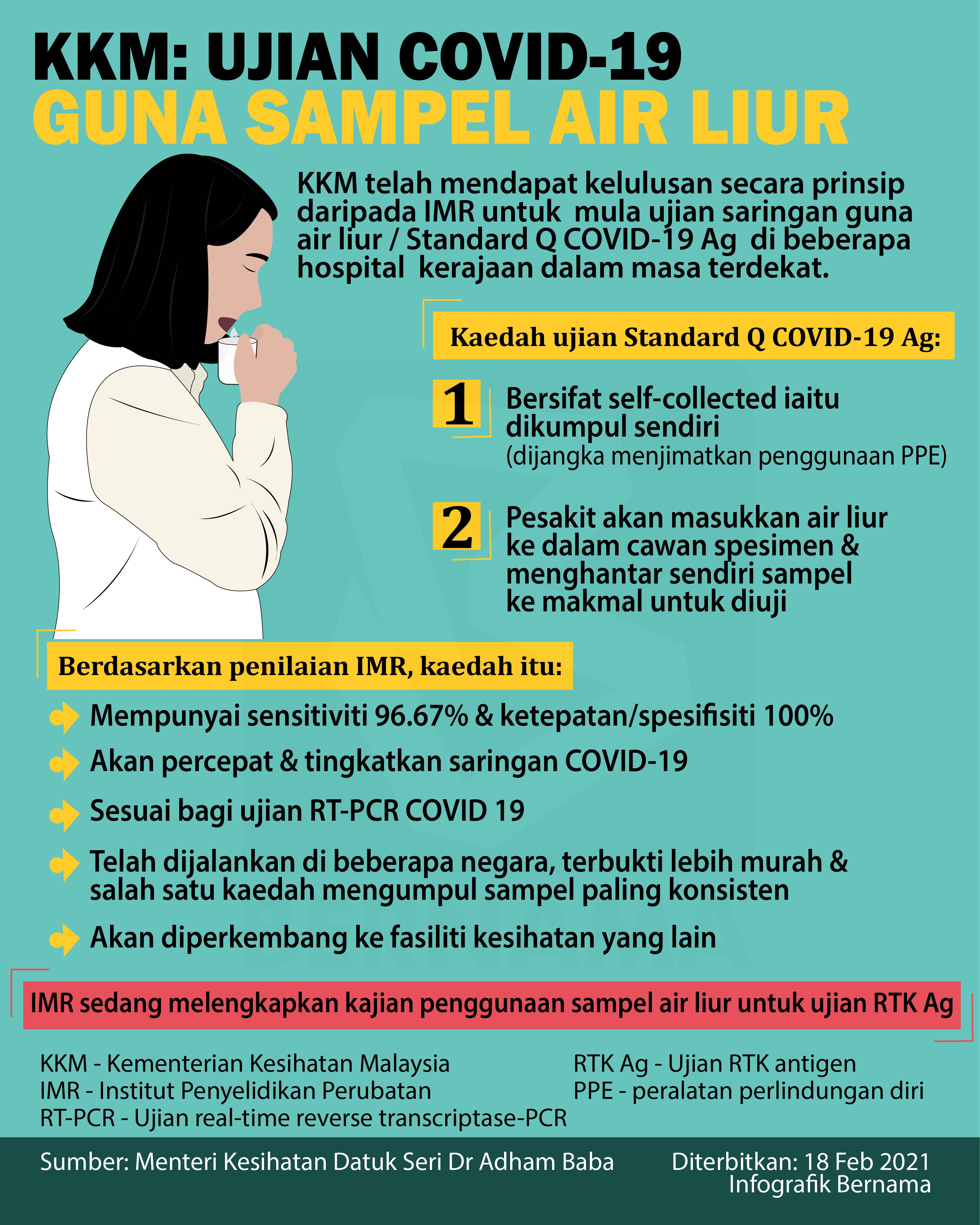 “KKM telah mendapat kelulusan secara prinsip daripada IMR untuk gunakan kaedah persampelan guna air liur ini di fasiliti kesihatan iaitu hospital kerajaan terlebih dahulu.